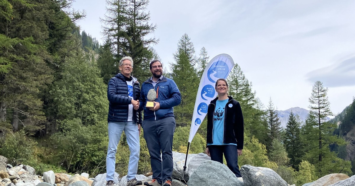 Im Bild (v.l.n.r.): Walter Wagner, Präsident Verein Gewässerperlen, Sebastian Arnold, Gemeindepräsident Simplon, Gabriele Aebli, Projektleiterin WWF Schweiz.